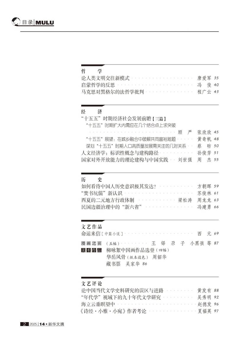 《新华文摘》创刊于1979年,由国家新闻出版署主管、人民出版社主办、新华文摘杂志社编辑出版,是大型理论性、综合性、资料性文摘类权威期刊。杂志每期精选弘扬时代主旋律、荟萃人文学术精华、凝聚中国经验的优秀文章,为广大读者提供了大量哲学社会科学新观点、新资料、新方法和文艺佳作,是我国极具影响的哲学社会科学文摘类杂志。