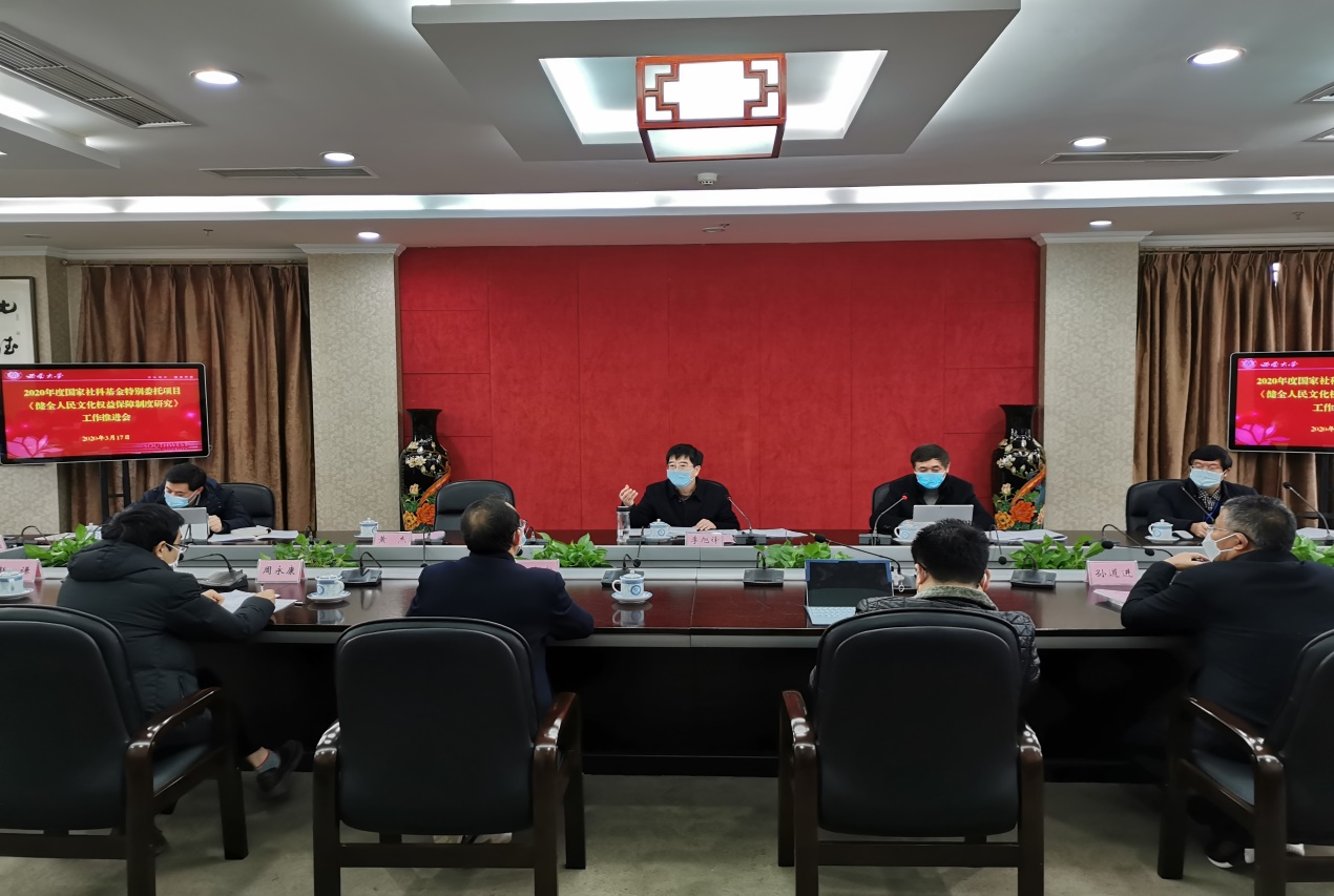 3月17日,依托全国重点马克思主义学院平台,由中宣部理论局委托学校党委负责的2020年度中央“马克思主义理论研究和建设工程”特别委托项目、国家社科基金特别委托项目《健全人民文化权益保障制度研究》工作推进会在校召开,首席专家党委书记李旭锋教授,各子课题组成员及党办、社科处负责同志参加会议。会议由党委副书记潘洵主持。
