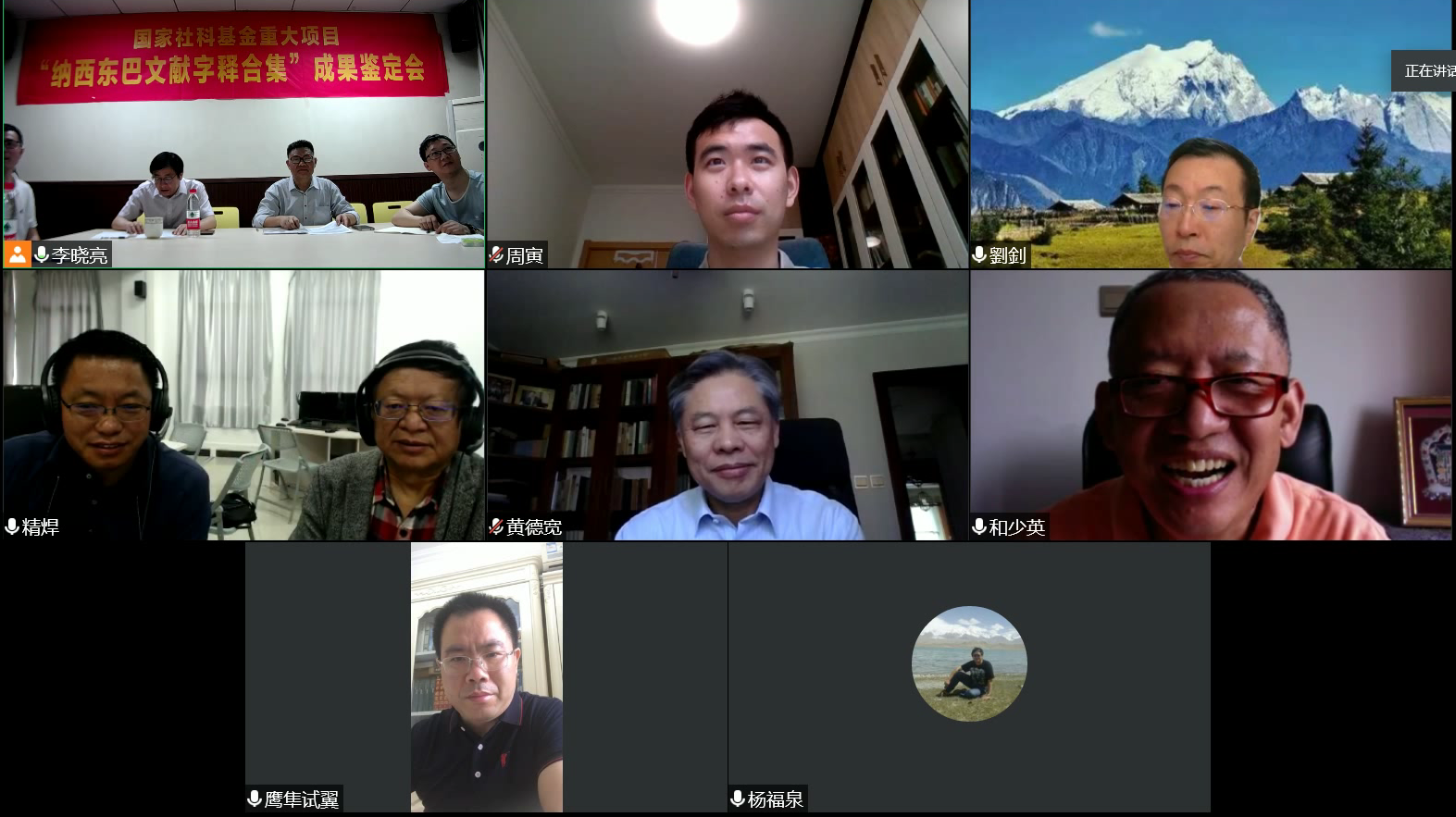 5月24日上午,学校汉语言文献研究所喻遂生教授任首席专家的国家社科基金重大项目“纳西东巴文献字释合集”(批准号:11&ZD129)成果鉴定会采用“云会议”的形式召开,主会场设在汉语言文献研究所会议室。参加成果鉴定会的有,成果鉴定专家组成员原云南民族大学副校长和少英教授、原云南省社科院副院长杨福泉研究员、清华大学出土文献研究与保护中心主任黄德宽教授、复旦大学出土文献与古文字研究中心主任刘钊教授、丽江师范高等专科学校民族文化研究中心副主任杨林军教授,重庆市社科规划办唐旺虎主任,PA视讯社科处吕刚武副研究员,以及项目组首席专家喻遂生教授和项目组成员代表。