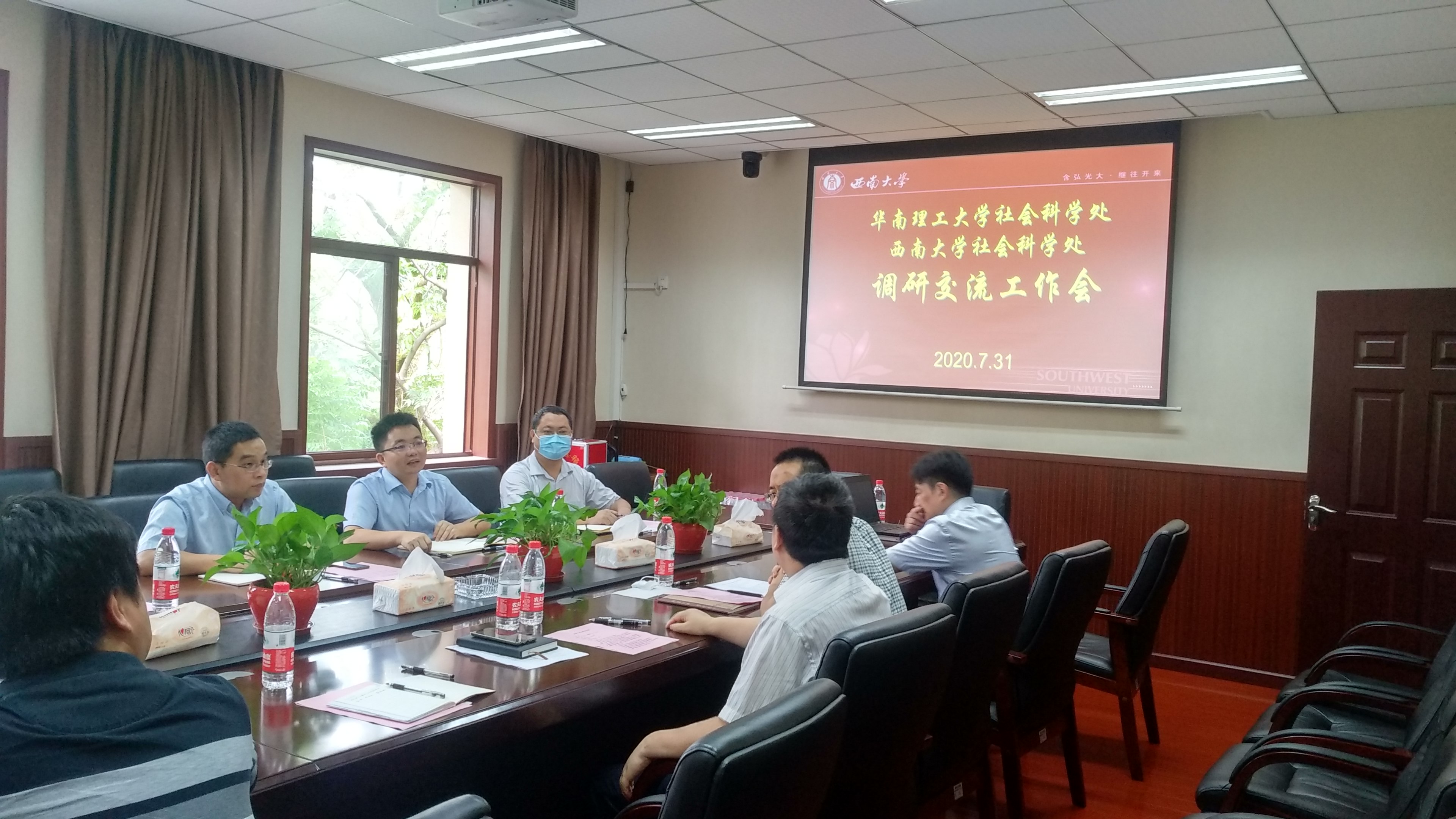 7月31日下午,华南理工大学社会科学处处长李石勇、智库建设管理办公室主任李秋成一行来我校社会科学处调研交流,并召开座谈会。会议由社会科学处处长邱江主持。社会科学处副处长徐中仁、王作军和其他工作人员参会。