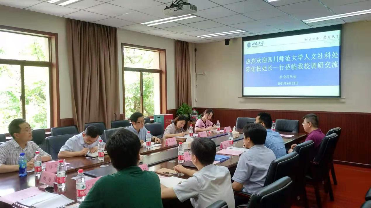 6月23日下午,四川师范大学人文社科处陈佑松处长一行来我校社会科学处调研交流。座谈会由社会科学处邱江处长主持,社会科学处班子成员及各科室负责人参会。