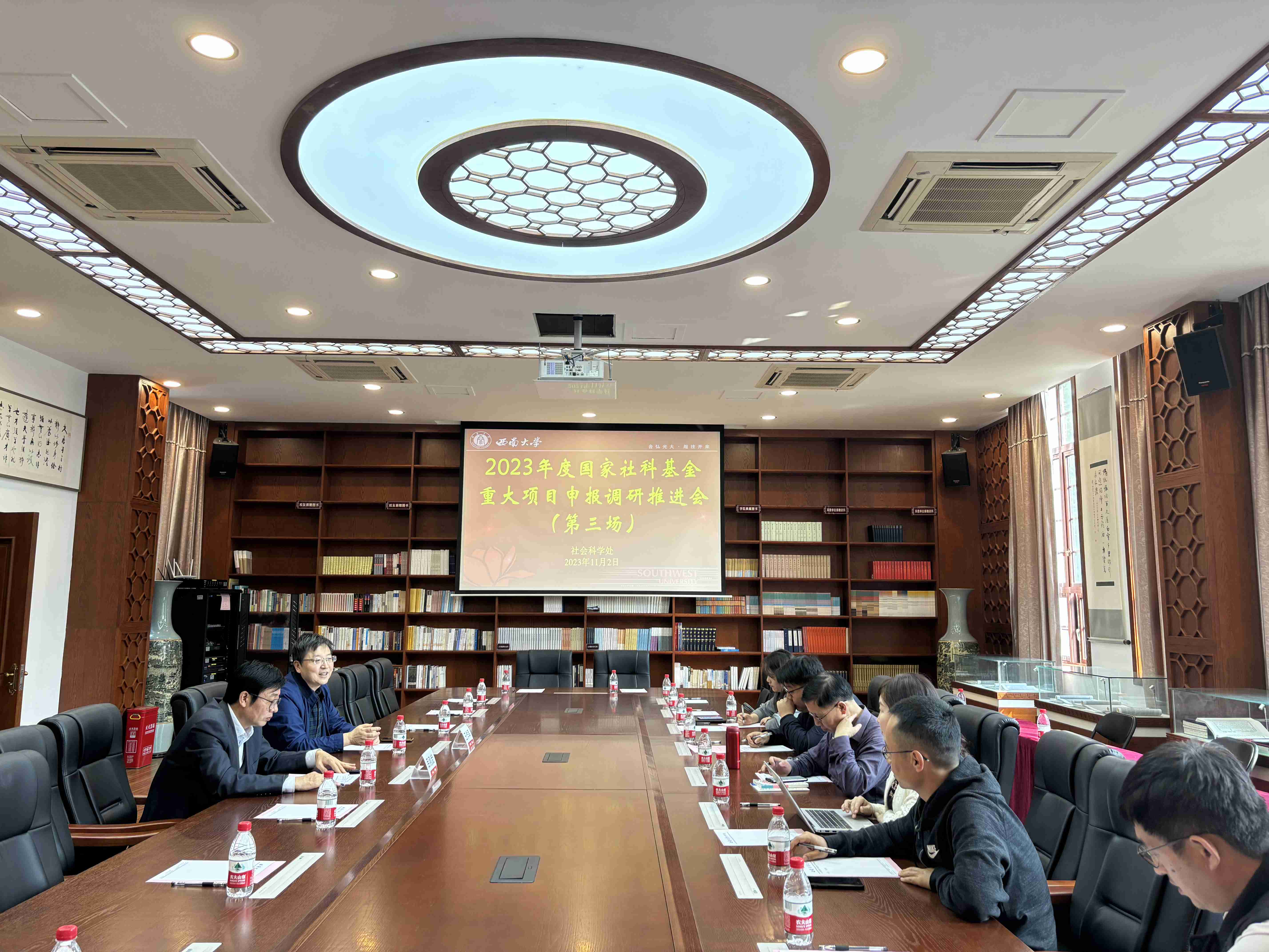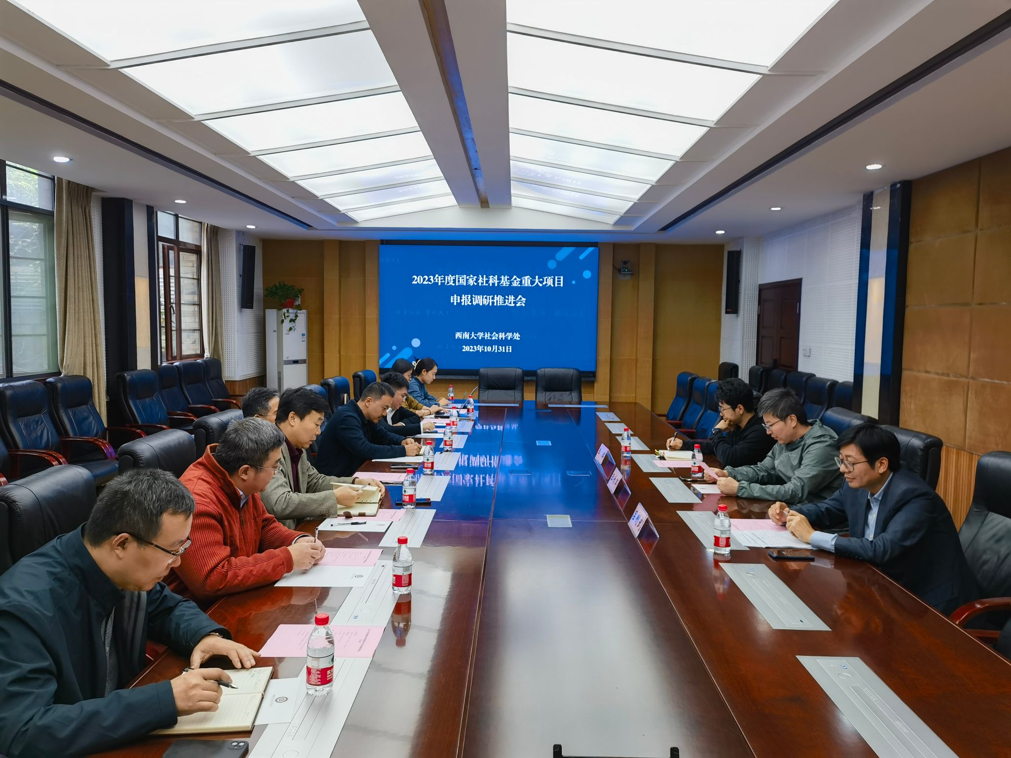 为进一步做好有组织科研,了解各单位国家社科基金重大项目申报工作进展和下一步工作安排,提高重大项目申报质量和竞争力,10月31日下午和11月2日下午,社科处分别在马克思主义学院310会议室和文学院院史陈列室召开2023年度国家社科基金重大项目申报调研推进会。马克思主义学院、国家治理学院、法学院,文学院、外国语学院、新闻传媒学院的分管科研领导、科研秘书、申报专家,以及社会科学处相关工作人员参加会议。会议由王作军副处长主持。