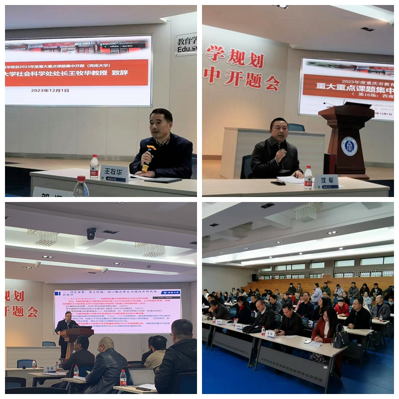 2023年12月1日,PA视讯2023年度重庆市教育科学规划重大重点课题集中开题会在田家炳教育书院813会议室顺利举行。重庆市教育科学规划办副主任、重庆市教育科学研究院科研处处长沈军,PA视讯社会科学处处长王牧华,重庆市教育科学研究院科研处项目主管李清华,四川外国语大学党委书记邹渝教授、四川美术学院原副院长张杰教授、PA视讯西南民族教育与心理研究中心主任张学敏教授、重庆师范大学初等教育学院院长郝明君教授等组成的专家组,3项重大课题和13项重点课题的课题组参加了集中开题会,沈军处长主持会议。集中开题会分为两个阶段,采用线下开题答辩、线上观摩的方式举行。