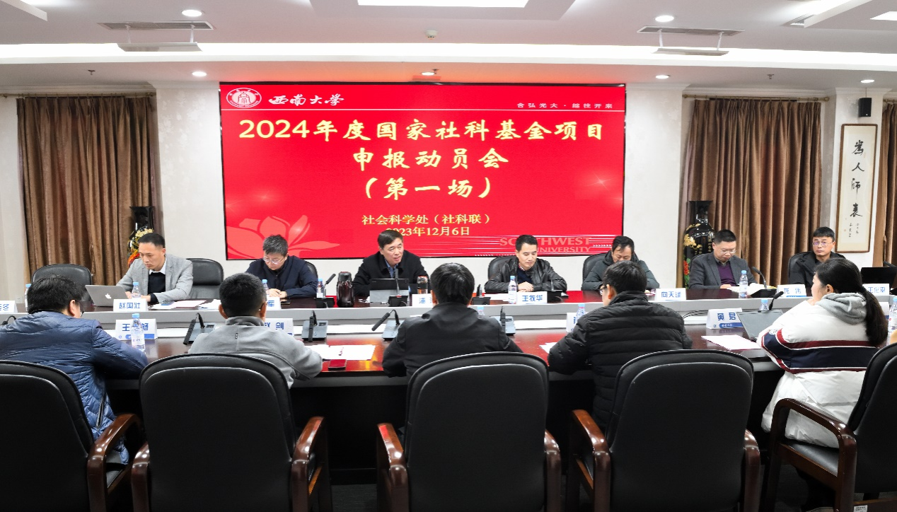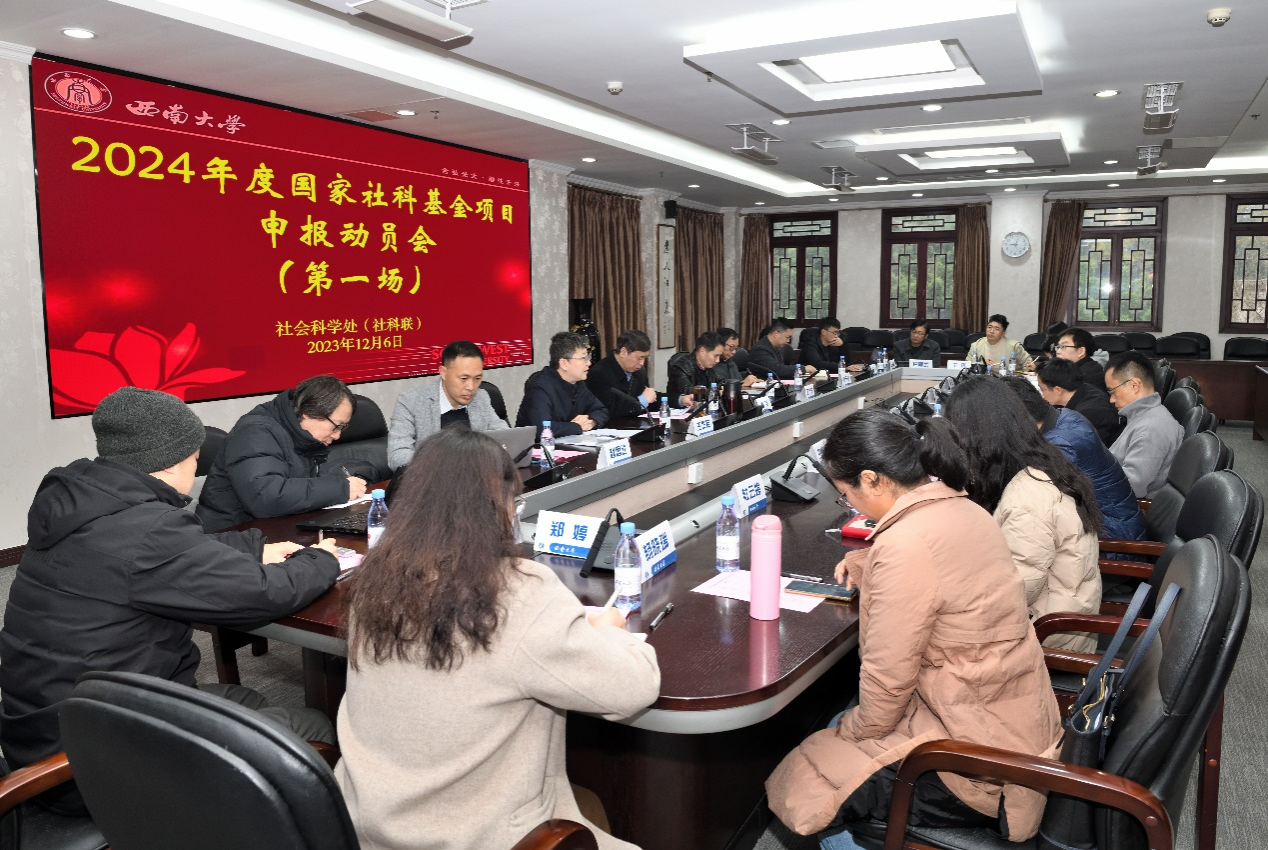为全面贯彻落实党的二十大精神,推动2024年度申报工作良好开展,明确目标,压实责任,12月6日社会科学处召开2024年度国家社科基金项目申报动员会(第一场)。学校党委副书记潘洵,文学院、外国语学院、历史文化学院 民族学院、汉语言文献研究所、中国新诗研究所、音乐学院、美术学院、新闻传媒学院的院(所)长、分管领导及科研秘书出席会议。会议由社会科学处处长王牧华主持。