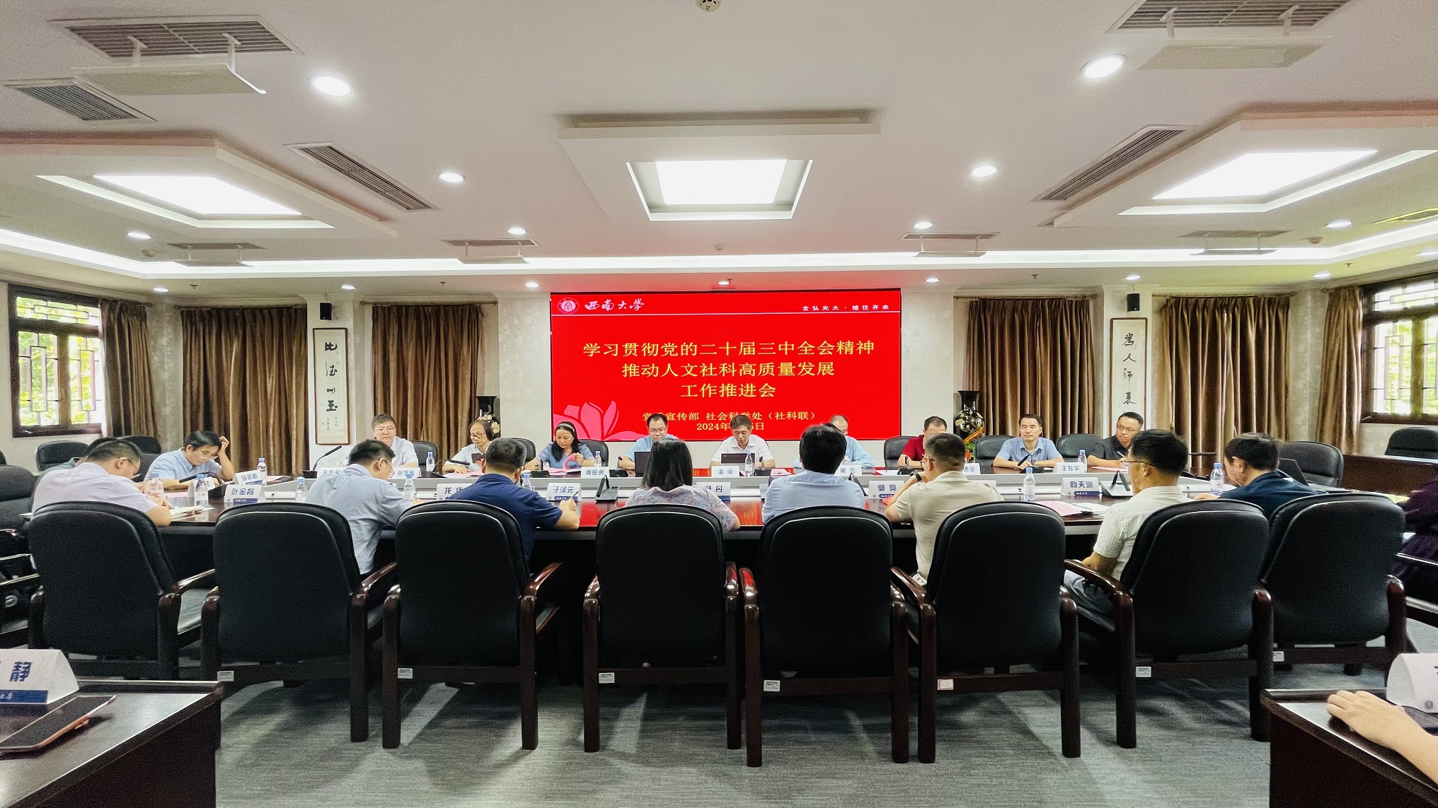 9月5日上午,PA视讯党委宣传部、社会科学处共同举办“学习贯彻党的二十届三中全会精神 推动人文社科高质量发展”工作推进会。学校党委副书记潘洵、黄杰,重庆市社科联规划评奖办主任唐旺虎,社科处处长王牧华出席会议,各文科单位主要负责人和分管科研领导、人文社科国家重点科研平台负责人参加会议。会议由社会科学处副处长王作军主持。