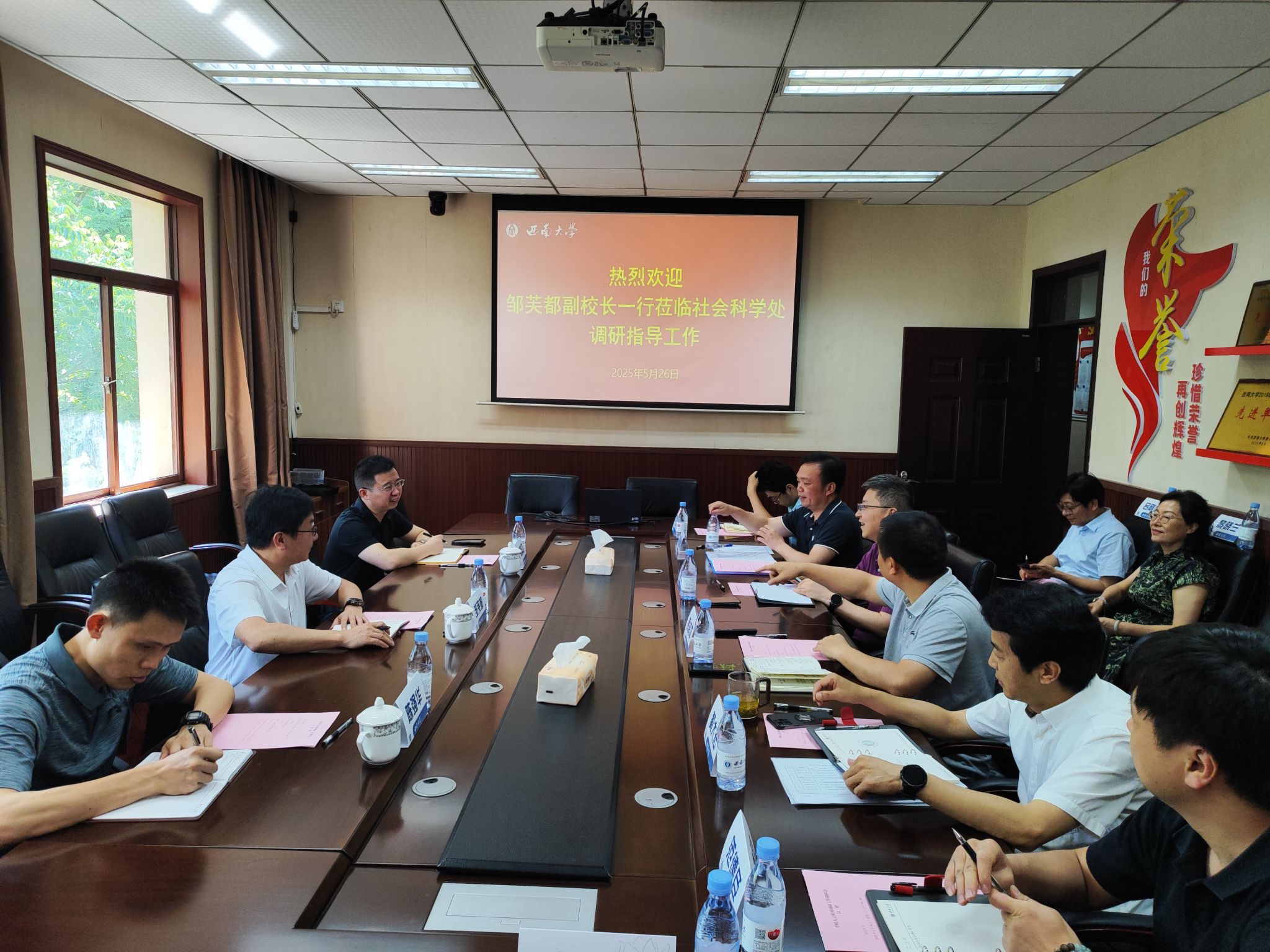 2025年5月26日上午,学校党委常委、副校长邹芙都到社科处调研学校人文社会科学科研工作开展情况。会议由社科处处长罗超平主持,党政办杨复卫副主任、陈强华科长陪同,社科处全体成员参加。