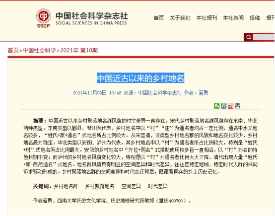 近日,历史文化学院 民族学院蓝勇教授撰写的论文《中国近古以来的乡村地名》在《中国社会科学》(2021年第10期)发表。