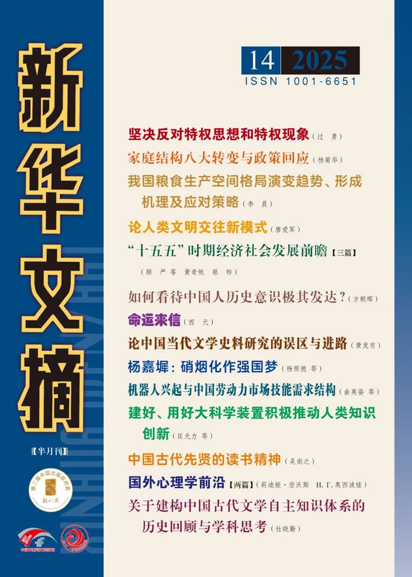 《新华文摘》创刊于1979年,由国家新闻出版署主管、人民出版社主办、新华文摘杂志社编辑出版,是大型理论性、综合性、资料性文摘类权威期刊。杂志每期精选弘扬时代主旋律、荟萃人文学术精华、凝聚中国经验的优秀文章,为广大读者提供了大量哲学社会科学新观点、新资料、新方法和文艺佳作,是我国极具影响的哲学社会科学文摘类杂志。