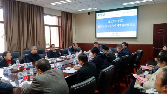 为在党史学习教育中扎实推进“我为群众办实事”主题实践活动,深入了解各有关高校相关社科工作情况,进一步调研国家社科基金和市级社科规划项目管理情况、推动新型智库建设取得成效、服务青年人才培养,11月26日,重庆市社科联阳奎兴副主席、重庆市社科联规划办唐旺虎主任、重庆市社科联规划办黄海调研员和重庆市智库办信桂新一行赴社会科学处开展调研座谈。我校智库负责人代表、青年教师代表、社会科学处领导班子全体成员及工作人员,参加了座谈会。会议由社科处处长邱江主持。
